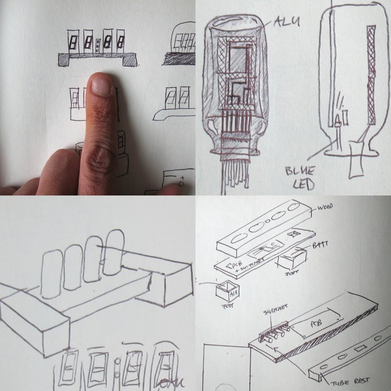 Let's get to it. I made a drawing and I'm gonna use oak wood for the housing, as well as aluminium and the tubes will have to be substituted by small jars :) In which I will put 7-segment displays which I will also make myself, don't know yet how.