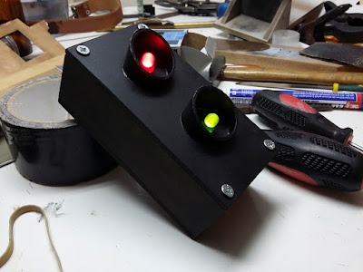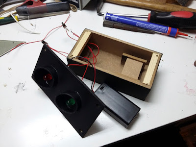 My cousin turned 8 years old and for his birthday he wanted something that could prevent his mom or anyone from entering his room without permission. Specifically, he wanted a stoplight. Naturally this appealed to my diy brain and I started working on it. I had no plan, I just wanted to make a wooden box with a red and green light, a batteryholder and a switch. Unfortunately I didn't have the right switch available so I had to mount separate switches for the red and green light. My cousin didn't bother with such technical details :)