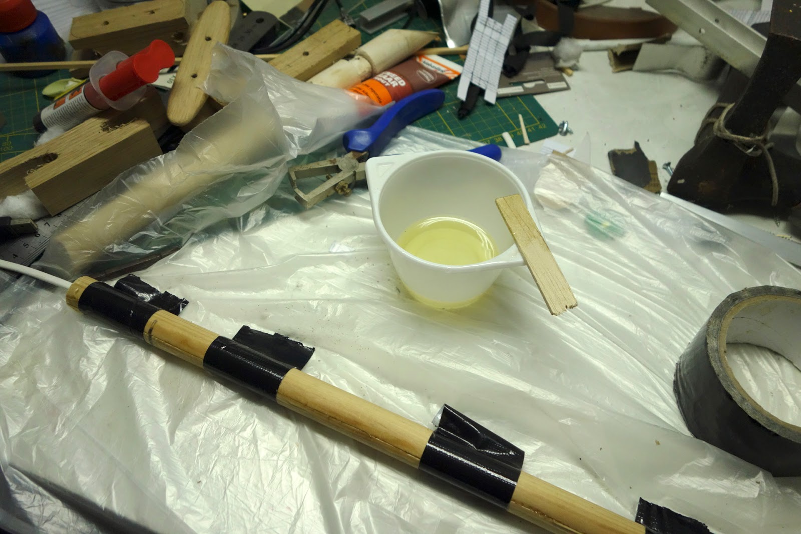 I then cut a wooden rod in half and hollowed out the center for the power cable. Glued back together with epoxy and I have a mast with a small light at the end.