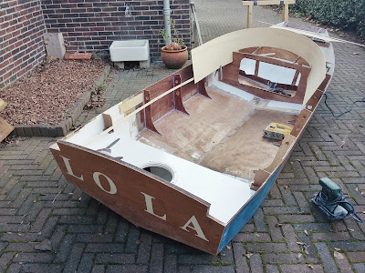 I've finally started painting the boat. Allthough the deck is far from perfect, I decided it would be nicer to show the wood instead of hiding it with paint. So the deck and coamings are in clear varnish. Interior in grey. Before that I reinforced the cockpit bottom with some slats. Still working on some deck fittings, the cleats mainly. Plan is to launch the boat in two weeks!