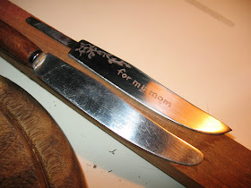 I just came across this instructable here about how to do some simple etching on steel. The idea is to cover your knife blade or other piece of steel with nail polish, scribe a text or pattern in the nail polish and then using electricity etching the metal. Be sure to use a battery (9 volt) and for safety reasons, don't use any wall mounted power supply. This is really fun to do. To get more advanced you could try getting stickers made from your computer designed logo or illustration and use that instead of the nail polish for a real professional look.