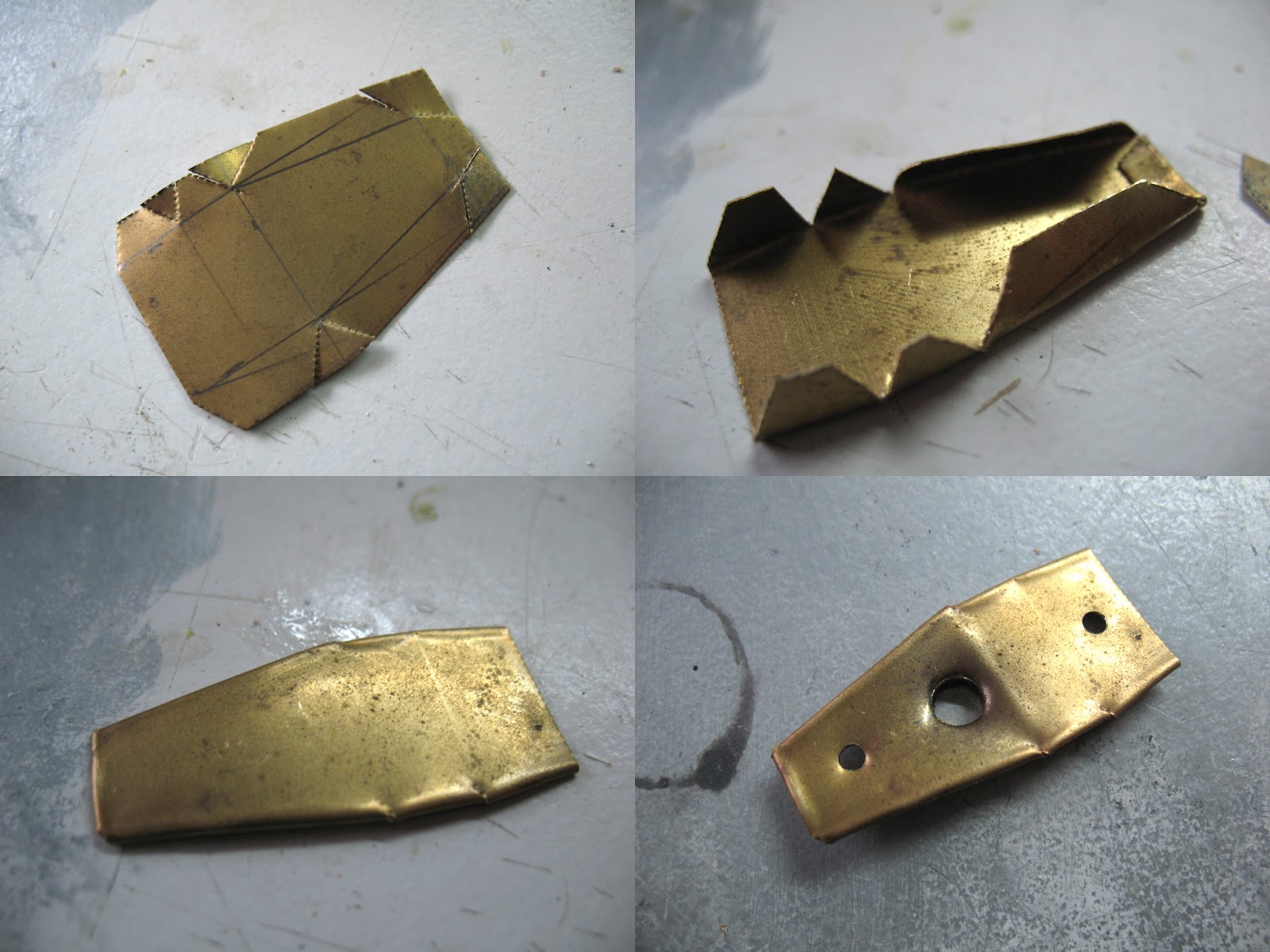 It's a brass plate that's cut in a way so I can fold it along the case edge. Holes are drilled for screws and the brass rod. This brass rod is used to hold a triangular wire that will clasp to the bottom part of the case. The rod is soldered to the brass plate but it also extends into the case wall to give it extra strength.