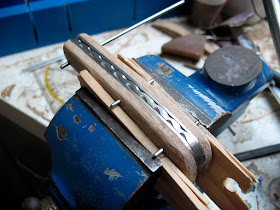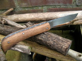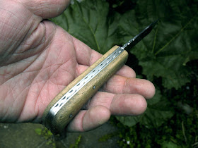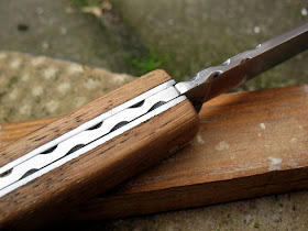 The spine is now flush with the handle and sanded smooth. Putting the blade on it requires putting tension on the spring (the spine) so that the blade can be locked open or closed. The last thing to do construction wise is to hammer the pins down. As it turned out I left the pins too long and bent the pins. Very disappointing but this is a lesson to remember for next time!