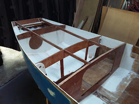 So I've cut my boat in half, added a new middle section, and now I'm working on making it one piece again. It's taking much more time than I expected, as usual. I made frames to support the new construction and recently started to add supports for the deck that will cover the front of the boat. The main part of this covered area will be used as flotation in case the boat get's swamped. Between the open cockpit and the flotation area is room for storage and you can see the opening for an access hatch I made.