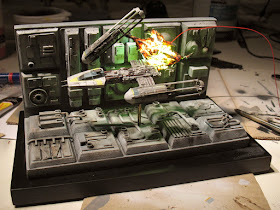 The diorama was pretty straightforward, built using pieces of wood and parts from a tank kit. The Y-wing model because it is so incredibly detailed was easy to build. However, the explosion part was a real headache, I tried all kinds of materials, foam, caulk, styrofoam, cotton. I finally got the best results soaking cotton in wallpaper glue and sculpting a cloud like shape.